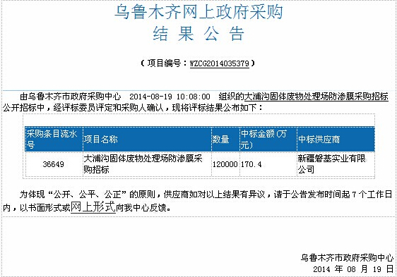烏 魯 木 齊 網(wǎng) 上 政 府 采 購 結(jié)果公告 (項目編號:WZCG2014035379) 由烏魯木齊市政府采購中心2014-08-1910:08:00組織的大浦溝固體廢物處理場防滲膜采購招標(biāo)公開招標(biāo)中,經(jīng)評標(biāo)委員評定